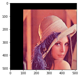 #縦幅、横幅をそれぞれ取り出す height, width = image.shape[:2] #変換行列の指定 横にa,縦にb動かしたい時は[ 1, 0, a],[ 0, 1, b]とする。(詳しくは後ほど!) M = np.float32([[1,0,100],[0,1,50]]) #画像を平行移動 (入力画像の配列、変換行列、出力画像サイズ) moved_image = cv2.warpAffine(rgb_image, M, (width, height)) plt.imshow(moved_image)